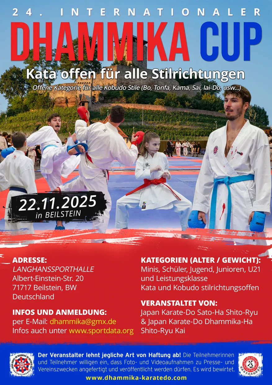 Der internationale Dhammika Cup in Beilstein ist ein traditionsreiches Karate- und Kobudo-Turnier, das seit fast 25 Jahren Kampfsportlerinnen und Kampfsportler aus dem In- und Ausland zusammenbringt. Als eines der wenigen Turniere, bei denen Kobudo eine eigenständige Disziplin ist, bietet es einzigartige Wettkämpfe, spannende Begegnungen und ein tolles Wettkampfumfeld. Die regelmäßig angereisten internationalen Gäste sorgen nicht nur für einen hohen sportlichen Anspruch, sondern auch für einen kulturellen Austausch. Alle Teilnehmenden, Trainer und Zuschauer sind herzlich eingeladen, Teil dieser lebendigen Tradition zu werden.
