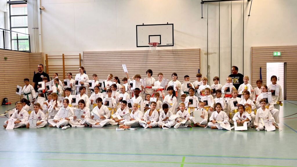 Kurz vor Beginn der Sommerferien hieß es am Sonntag, den 23. Juli 2023 für 64 Kinder der Dhammika Karate-Do Kinder ein letztes Mal in die Vollen zu gehen und sich nach einer langen und intensiven Vorbereitungszeit den hohen Anforderungen einer Gürtelprüfung zu stellen. Die Kinder mussten dabei ein festgelegtes Prüfungsprogramm absolvieren und dabei ihr Können demonstrieren. Geprüft wurden die drei Säulen des Karate-Do: Kihon (Grundschule), Kata (Formenlauf), Bunkai (äußere Anwendung der Kata, um das Verständnis einer Kata zu überprüfen) sowie Kumitetechniken. Um der großen Anzahl der Kinder aus den Anfängergruppen im Rahmen der Prüfung überhaupt gerecht zu werden, waren mit Shihan Athula, Sensei Jutta, Sensei Melike und Sensei Dominik gleich vier Prüfer im Einsatz, sodass ihnen nichts entging.