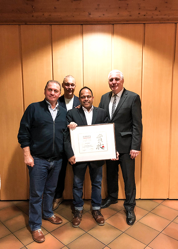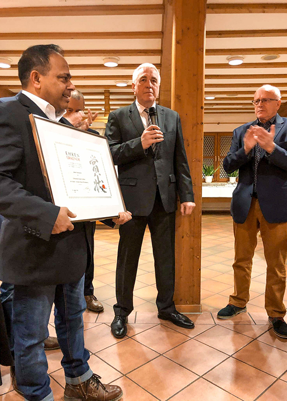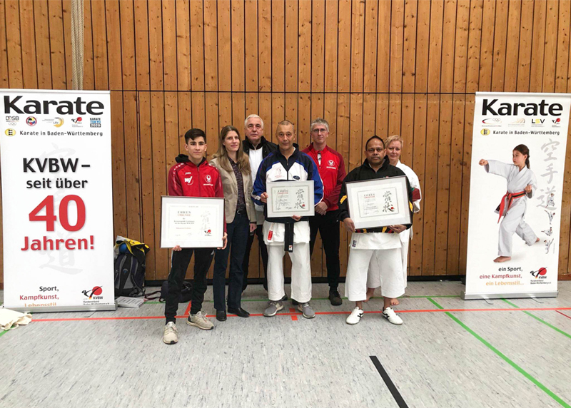 Last Saturday, 25 January 2020, this year’s KVBW trainers’ meeting took place in Laupheim with several hundred karatekas. As part of this event, Shihan Athula Minithanthri, the KVBW’s Shito-Ryu style referent, not only performed the kata Tomari Bassai, but also received a very special honour to his surprise. In recognition and appreciation of his special sporting achievements and services to the association, Shihan Athula was awarded the certificate of honour and silver badge of honour by the KVBW (Karate Association of Baden-Württemberg).