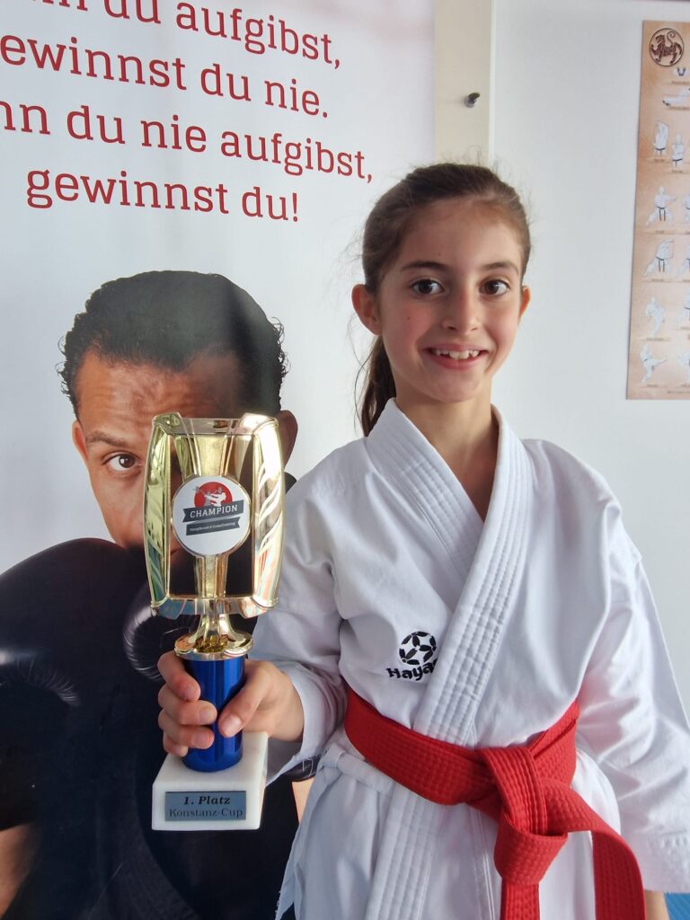 Nine-year-old Laura P., who trains at Dhammika Karate-Do Abstatt, took part in the kata discipline at the 15th Konstanz Cup in Konstanz on Lake Constance last Saturday, 8 July 2023. This tournament is aimed at beginners and newcomers, and a total of eight girls competed in the ‘Girls, 8–9 Years’ category, demonstrating set techniques. The competition was held using a knockout system with a flag system.