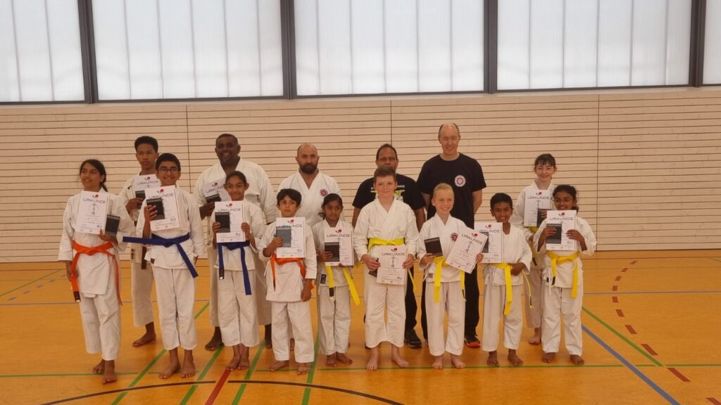 Last Saturday, 1 July 2023, this year’s kyu examinations took place in Ditzingen-Hirschlanden for the karatekas from the karate department of Hirschlanden-Schöckingen 1947 e.V. sports club. Under the guidance of the founder of Japan Karate-Do Dhammika-Ha Shitoryu Kai, Shihan Athula Minithanthri, and SVGG karate department head Sensei Uli Hasenknox, a total of 14 participants were able to demonstrate their skills and meet the requirements of a kyu examination.