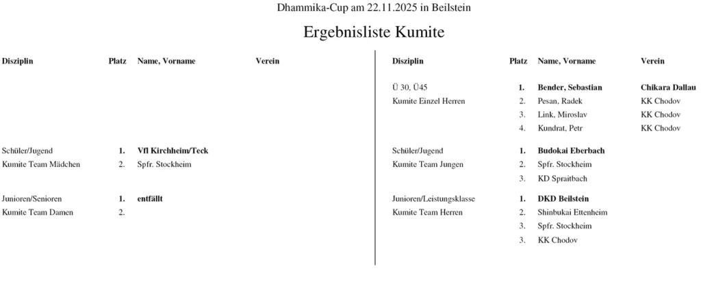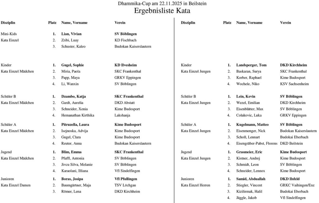 The International Dhammika Cup 2025 took place in Beilstein on 22 November 2025. We are delighted that athletes from the Japan Karate-Do Dhammika-Ha Shitoryu Kai secured numerous podium places. We are particularly proud that the Dhammika karateka achieved podium places across all age groups and disciplines. This demonstrates our strength and diversity in karate. The most successful dojos were Dhammika Karate-Do Kirchheim and Dhammika Karate-Do Amorbach. In total, the Dhammika karatekas secured 20 podium places.